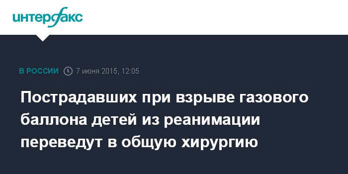 Москва. 7 июня. INTERFAX.RU - Двое пострадавших при взрыве газового баллона детей переводятся из реанимации больницы имени Сперанского в отделение общей хирургии, сообщил главный врач клиники Анатолий Корсунский.