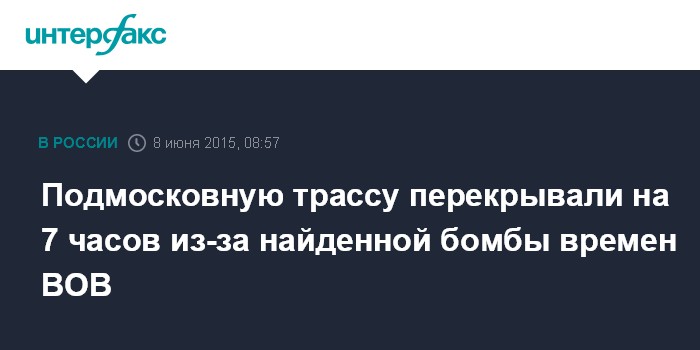 Москва. 8 июня. INTERFAX.RU - Авиабомбу времен войны обнаружил пенсионер в подмосковной речке, на время разминирования на протяжении семи часов была перекрыта дорога Хотьково - Дмитров, сообщили "Интерфаксу" в пресс-центре МВД России.