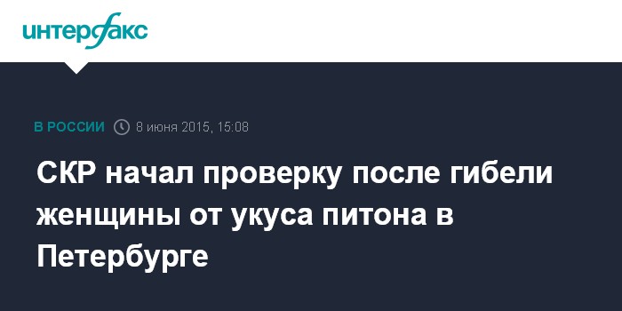 Москва. 8 июня. INTERFAX.RU - Доследственная проверка проводится по факту гибели женщины от укуса домашнего питона в Петербурге, сообщили "Интерфаксу" в пресс-службе Главного следственного управления СКР по северной столице в понедельник.