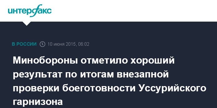 Москва. 10 июня. INTERFAX.RU - Части подразделения Уссурийского гарнизона, поднятые накануне по тревоге министром обороны России Сергеем Шойгу, успешно выполнили все поставленные перед ними задачи и вернулись в места постоянной дислокации.