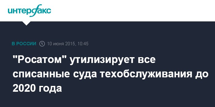Москва. 10 июня. INTERFAX.RU - Госкорпорация "Росатом" в рамках целевой программы "Ядерная радиационная безопасность-2" до 2020 года планирует утилизировать все списанные суда технического обслуживания и плавбазы атомного флота, сообщил глава" Росатома" Сергей Кириенко в среду в Челябинске на VIII региональном общественном форуме-диалоге "70 лет Российскому Атому".