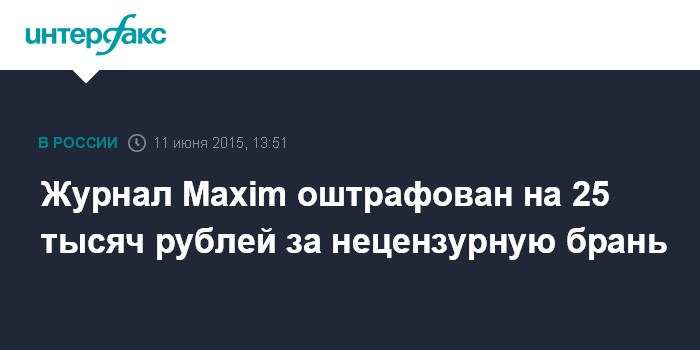 Москва. 11 июня. INTERFAX.RU – Симоновский суд Москвы оштрафовал журнал Maxim за использование нецензурной лексики в майском номере издания.