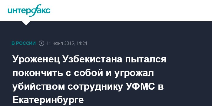 Москва. 11 июня. INTERFAX.RU - Уроженец Узбекистана пытался покончить с собой и угрожал убийством сотруднику УФМС в Екатеринбурге, сообщает пресс-группа УМВД РФ по городу.