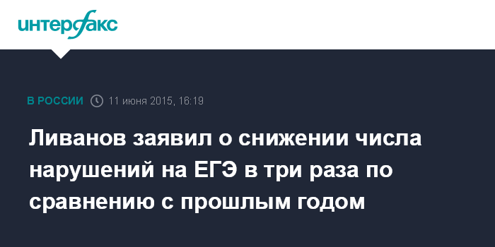 Москва. 11 июня. INTERFAX.RU - Глава Минобрнауки РФ Дмитрий Ливанов заявил, что число нарушений школьниками порядка проведения ЕГЭ в 2015 году снизилось в три раза по сравнению с прошлым годом.