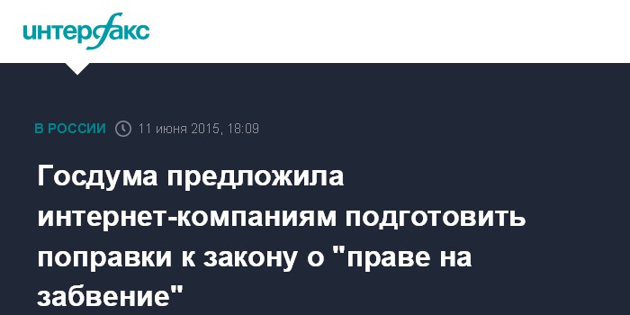Как сообщалось, законопроект о "праве на забвение", обязывающий интернет-поисковики (по нормам документа к ним можно отнести любые сайты с встроенным поиском - ИФ) удалять ссылки на информацию о гражданах по требованию последних, был внесен в Госдуму 29 мая.