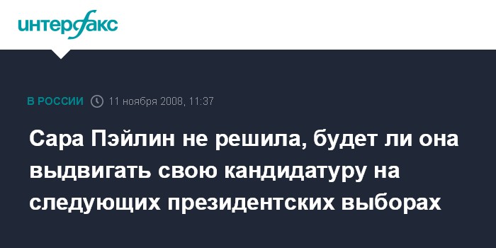 Москва. 11 ноября. INTERFAX.RU - Кандидат в вице-президенты США от республиканцев Сара Пэйлин, потерпевшая поражение на недавних выборах, заявила, что пока не знает, будет ли она выдвигать свою кандидатуру на пост президента страны в 2012 году.