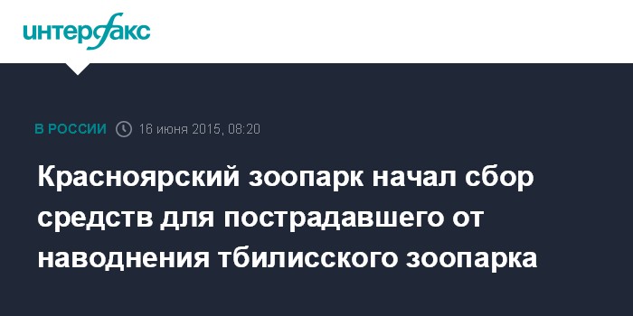 Москва. 16 июня. INTERFAX.RU - Сбор денежных средств для помощи пострадавшему от разрушительного наводнения тбилисскому зоопарку (Грузия) объявил красноярский зоопарк "Роев ручей", говорится на официальной странице сибирского зоопитомникав ссети.