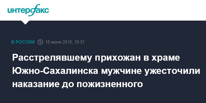 Москва. 18 июня. INTERFAX.RU - Верховный суд РФ ужесточил приговор Степану Комарову, застрелившему двух человек в храме Южно-Сахалинска и ранившего еще семерых, назначив пожизненное заключение, сообщили "Интерфаксу" в пресс-службе Генпрокуратуры РФ.