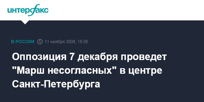 Москва. 11 ноября. INTERFAX.RU - Организаторы "Марша несогласных", запланированного в Петербурге на 7 декабря, намерены в ближайшее время подать соответствующую заявку в Смольный.