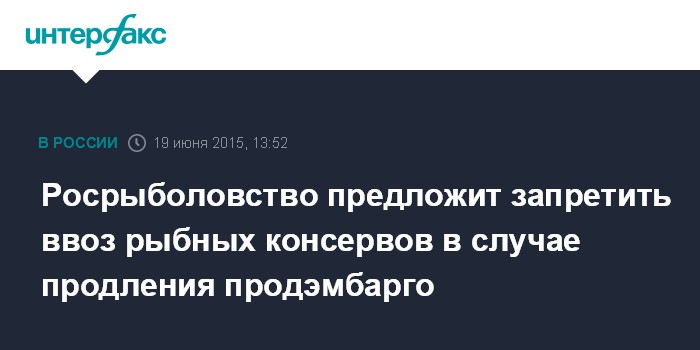 Москва. 19 июня. INTERFAX.RU - Росрыболовство считает необходимым включить рыбные консервы в список продукции, подпадающей под продовольственное эмбарго.
