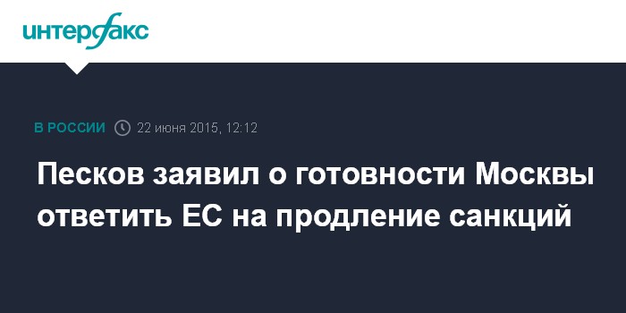 Москва. 22 июня. INTERFAX.RU - Россия ответит взаимностью на решение Евросоюза о продлении антироссийских санкций, заявил пресс-секретарь российского президента Дмитрий Песков.