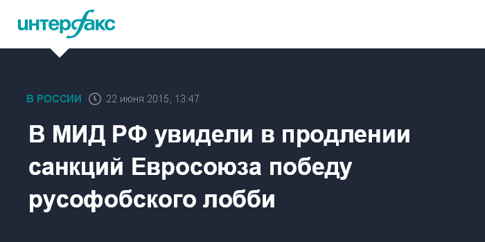 Москва. 22 июня. INTERFAX.RU - МИД РФ критически отреагировал на решение Евросоюза о продлении секторальных экономических санкций в отношении России до 31 января 2016 года.