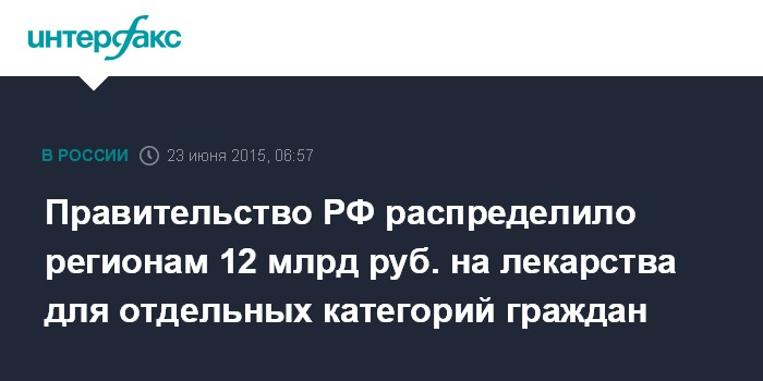 Москва. 23 июня. INTERFAX.RU - Премьер-министр России Дмитрий Медведев подписал постановление о распределении в 2015 году межбюджетных трансфертов регионам на улучшение лекарственного обеспечения граждан, сообщает во вторник сайт правительства РФ.
