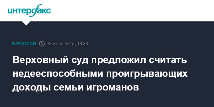 Москва. 23 июня. INTERFAX.RU - Пленум Верховного суда РФ считает, что россиян, которые страдают пристрастием к азартным играм и лишают свои семьи средств к существованию, следует признавать недееспособными при наличии любых доказательств.