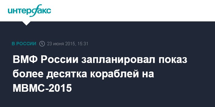 Москва. 23 июня. INTERFAX.RU - В Международном военно-морском салоне МВМС-2015, который пройдет в Санкт-Петербурге с 1 по 5 июля, от ВМФ России примут участие свыше 10 боевых кораблей, катеров и судов обеспечения, сообщил во вторник "Интерфаксу" официальный представитель ВМФ капитан первого ранга Игорь Дыгало.