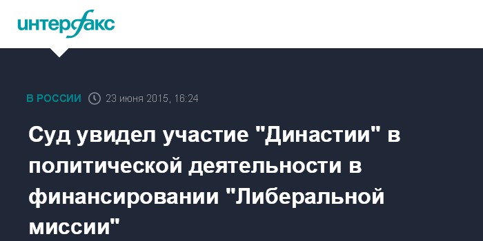 "Суд считает, что доводы представителей юридического лица о том, что Фонд некоммерческих программ Дмитрия Зимина "Династия" фактически не осуществляет политическую деятельность, несостоятельны, так как судом установлено, что Фонд "Династия" финансирует политическую деятельность Фонда "Либеральная миссия", т.е. принимает непосредственное участие в деятельности последнего, и то обстоятельство, что Фонд "Династия" не имел собственных политических проектов, не имеет значения для квалификации его действий", - говорится в постановлении судьи Сергея Комлева о назначении административного наказания "Династии", копия которого имеется в распоряжении "Интерфакса".