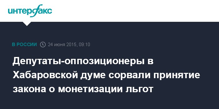 Москва. 24 июня. INTERFAX.RU - Хабаровская краевая дума не смогла принять в первом чтении законопроект о монетизации транспортных льгот из-за отсутствия кворума, сообщили агентству "Интерфакс" в парламенте в среду.