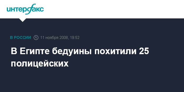 По сообщению египетских спецслужб, инцидент произошел на Синайском полуострове. Машину с полицейскими, которая направлялась к границе с Израилем, остановили три пикапа с вооруженными бедуинами, которые увезли их в неизвестном направлении.