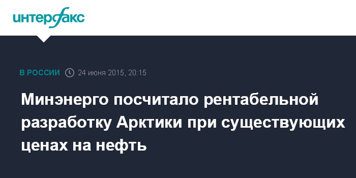 Москва. 24 июня. INTERFAX.RU - Минэнерго считает рентабельной разработку Арктики при существующих ценах на нефть, сообщил журналистам замминстра энергетики РФ Кирилл Молодцов.