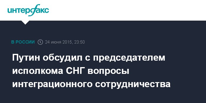 Москва. 24 июня. INTERFAX.RU - Президент России Владимир Путин обсудил с председателем исполкома Содружества независимых государств Сергеем Лебедевым вопросы текущую ситуацию в СНГ и вопросы интеграционного сотрудничества, сообщил пресс- секретарь президента РФ Дмитрий Песков.
