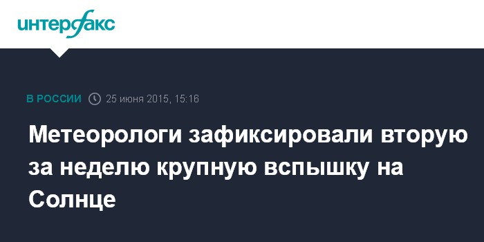 Москва. 25 июня. INTERFAX.RU - Метеорологи зафиксировали вторую за неделю крупную вспышку на Солнце, сообщает в четверг сайт Гидрометцентра России.