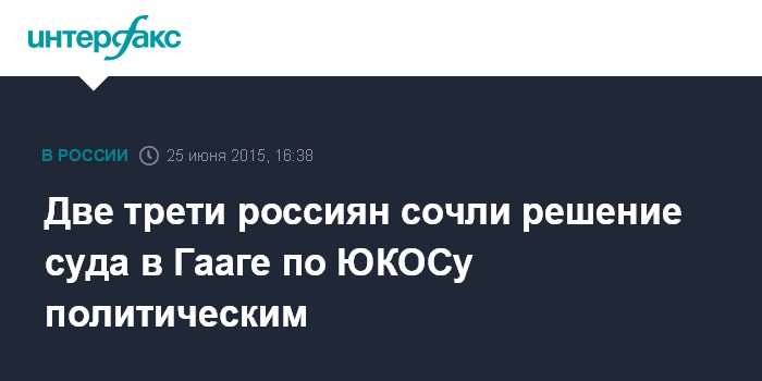 Москва. 25 июня. INTERFAX.RU - Более половины россиян (60%) назвали политически мотивированным решение третейского суда в Гааге о выплате $50 млрд в пользу бывших акционеров ЮКОСа, сообщили "Интерфаксу" в "Левада-Центре".
