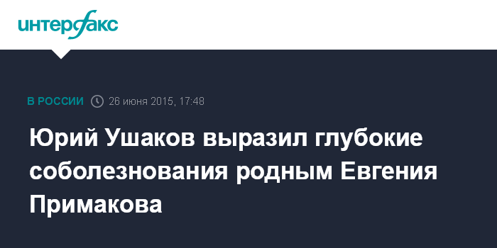 Москва. 26 июня. INTERFAX.RU - Помощник президента РФ Юрий Ушаков выразил глубокие соболезнования родным Евгения Примакова, скончавшегося в пятницу ночью после долгой и продолжительной болезни.