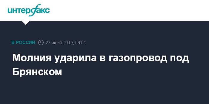 Москва. 27 июня. INTERFAX.RU - В результате попадания молнии в трубу газопровода в Брянске произошло возгорание, сообщили "Интерфаксу" в региональном управлении МЧС.