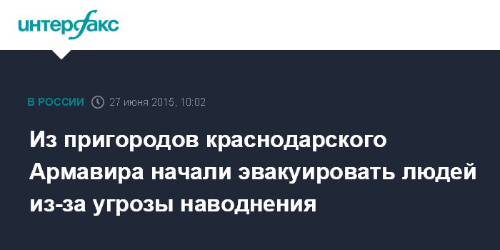 Москва. 27 июня. INTERFAX.RU - Власти Армавира в субботу проводят эвакуацию людей из пригородных поселков в связи с угрозой затопления, сообщили "Интерфаксу" в экстренных службах города.