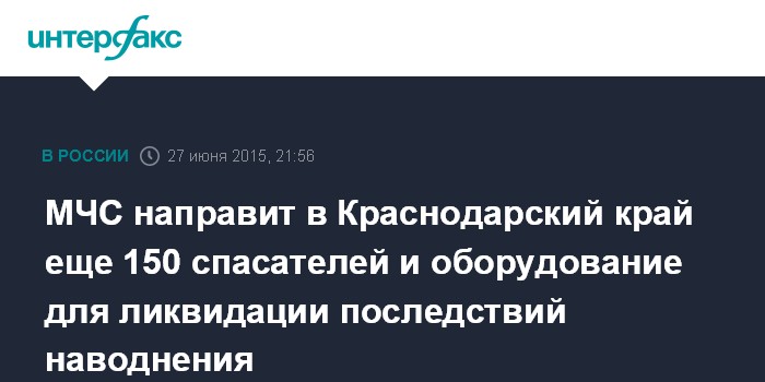 Москва. 27 июня. INTERFAX.RU - МЧС России перебрасывает дополнительно 150 спасателей и оборудование в Краснодарский край для ликвидации последствий ливневых дождей, два спецборта вылетели из Ростовской области и Ставропольского края, сообщили журналистам в субботу в пресс-службе ведомства.
