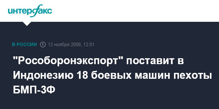 Москва. 12 ноября. INTERFAX.RU - Подписан контракт на поставку в Индонезию партии из 18 боевых машин пехоты БМП-3Ф, сообщил директор по особым поручениям "Рособоронэскпорта" Николай Димидюк. "Такой контракт подписан в этом году. Речь идет о поставке в Индонезию 18 БМП-3Ф", - сообщил он журналистам в Москве в среду.