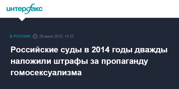 Москва. 29 июня. INTERFAX.RU - Российские суды в 2014 году вынесли два решения о назначении штрафа за пропаганду нетрадиционных сексуальных отношений.