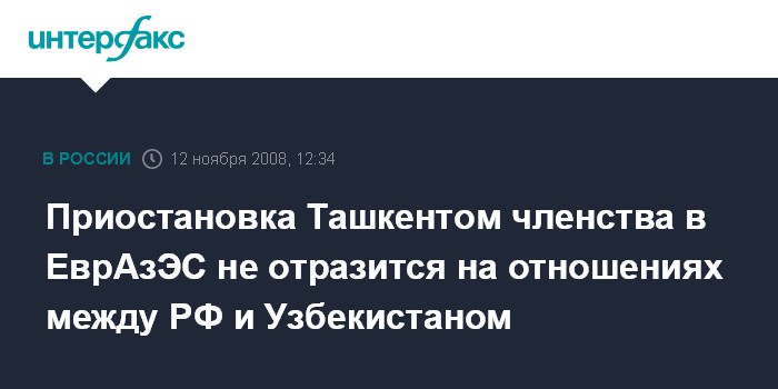 Москва. 12 ноября. INTERFAX.RU - В Москве рассчитывают, что решение Узбекистана о приостановлении членства в ЕврАзЭС не скажется на двусторонних отношениях между Москвой и Ташкентом.