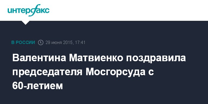Москва. 29 июня. INTERFAX.RU - Спикер Совета Федерации РФ Валентина Матвиенко поздравила председателя Мосгорсуда Ольгу Егорову с 60-летием и поблагодарила за огромный вклад в развитие судебной системы.