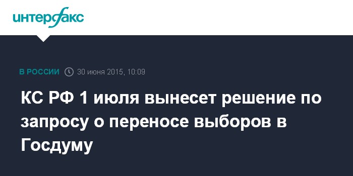 Москва. 30 июня. INTERFAX.RU - Постановление по делу о толковании статей Конституции о возможности переноса выборов депутатов Государственной думы РФ будет провозглашено в Конституционном суде на заседании в среду, 1 июля.