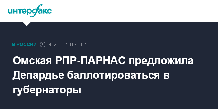 Москва. 30 июня. INTERFAX.RU - Омское отделение партии РПР-ПАРНАС предложило французскому актеру с российским гражданством Жерару Депардье стать кандидатом на пост губернатора региона, сообщил во вторник "Интерфаксу" руководитель отделения Игорь Басов.