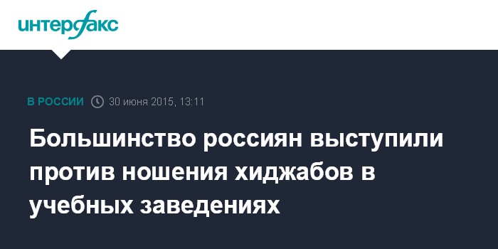 Москва. 30 июня. INTERFAX.RU - Подавляющее большинство жителей РФ (74%) считают недопустимым посещение занятий в учебных заведениях в хиджабе, сообщили "Интерфаксу" во вторник в "Левада-Центре".