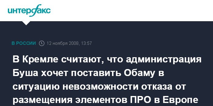 В Кремле считают, что администрация Буша хочет поставить Обаму в ситуацию невозможности отказа от размещения элементов ПРО в Европе