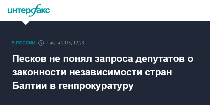 Москва. 1 июля. INTERFAX.RU - Пресс-секретарь президента РФ Дмитрий Песков заявил, что не понимает сути направленного в Генпрокуратуру РФ депутатского запроса о проверке законности признания независимости прибалтийских республик со стороны Госсовета СССР.