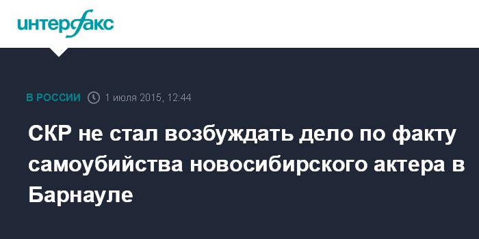 Москва. 1 июля. INTERFAX.RU - Первый отдел по расследованию особо важных дел следственного управления СКР по Алтайскому краю не стал возбуждать уголовное дело по факту самоубийства актера новосибирского театра "Красный факел" Данила Ляпустина в Барнауле.
