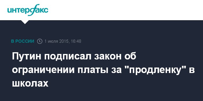 Москва. 1 июля. INTERFAX.RU - Президент России Владимир Путин подписал поправки в закон об образовании, которые ограничивают плату за пребывание школьников в группах продленного дня и за присмотр и уход за детьми в детских садах.