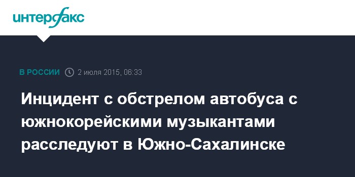 Москва. 2 июля. INTERFAX.RU - Автобус с музыкантами южнокорейского молодежного оркестра "Надежда" неизвестные обстреляли, предположительно, из пневматического ружья в Южно-Сахалинске днем в среду, сообщают в четверг сахалинские СМИ.
