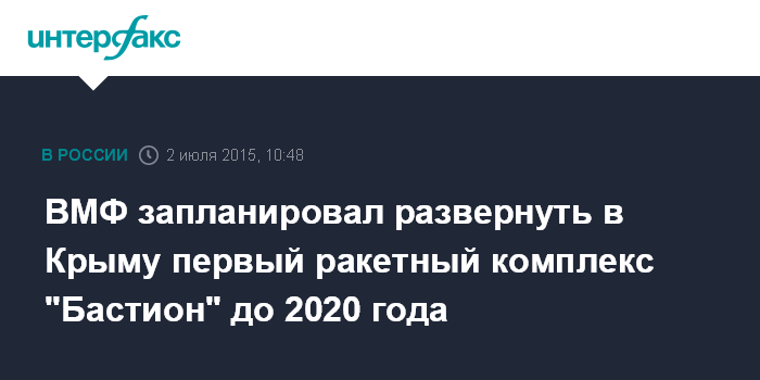 Москва. 2 июля. INTERFAX.RU – Первый противокорабельный береговой ракетный комплекс "Бастион" стационарного базирования, перекрывающий акваторию Черного моря, будет развернут в Крыму в ближайшие пять лет, сообщили "Интерфаксу" в четверг в Главном штабе ВМФ.