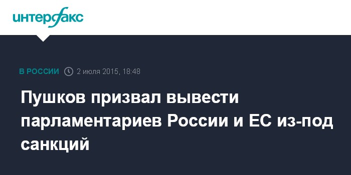 "Эта практика (персональных санкций - ИФ) наносит серьезный вред политическому диалогу и межпарламентским контактам, и мы призываем Евросоюз отказаться от нее и вывести парламентариев из ограничительных списков. В случае если это сделает Евросоюз, по тому же пути пойдет и Российская Федерации", - сказал Пушков "Интерфаксу" в четверг.