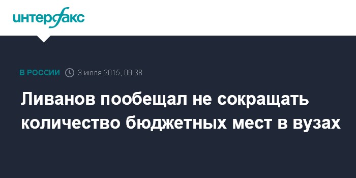 Москва. 3 июля. INTERFAX.RU - Глава Минобрнауки РФ Дмитрий Ливанов заявил о сохранении гарантированного количества бюджетных мест в вузах страны, несмотря на инициативы Минфина РФ сократить их финансирование.
