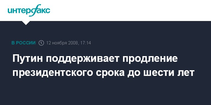 Москва. 12 ноября. INTERFAX.RU - Премьер-министр РФ Владимир Путин заявил, что он поддерживает предложения о продлении президентского срока до шести лет, но говорить о том, кто будет баллотироваться на следующих президентских выборах, преждевременно.