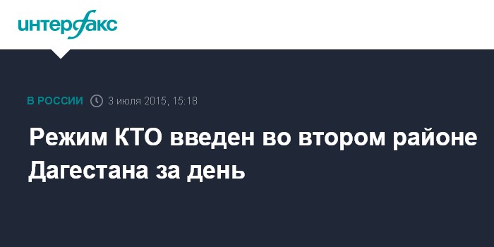 Москва. 3 июля. INTERFAX.RU - Правовой режим КТО введен в пятницу в 15:00 в городе Дербенте и Дербентском районе, сообщили агентству "Интерфакс" в Оперативном штабе в Дагестане.