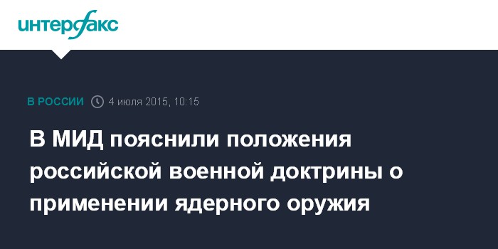 "В соответствии с доктриной, как и прежде, Российская Федерация оставляет за собой право применить ядерное оружие в двух случаях: в ответ на применение против нее и (или) ее союзников ядерного и других видов оружия массового уничтожения, а также в случае агрессии против нее с применением обычного оружия, когда под угрозу поставлено само существование российского государства", - сказал он, комментируя недавние заявления относительно "российской ядерной риторики".