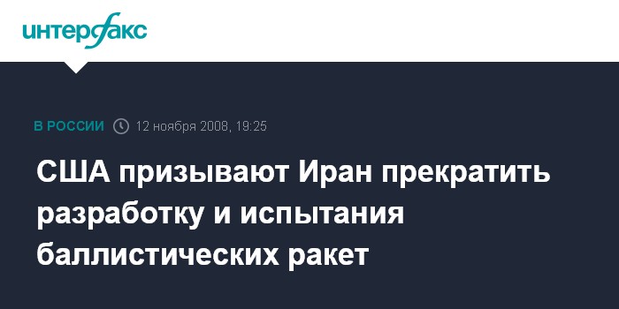 Москва. 12 ноября. INTERFAX.RU - Белый дом в среду выступил с призывом к Исламской республике Иран незамедлительно прекратить разработку ракет нового поколения.