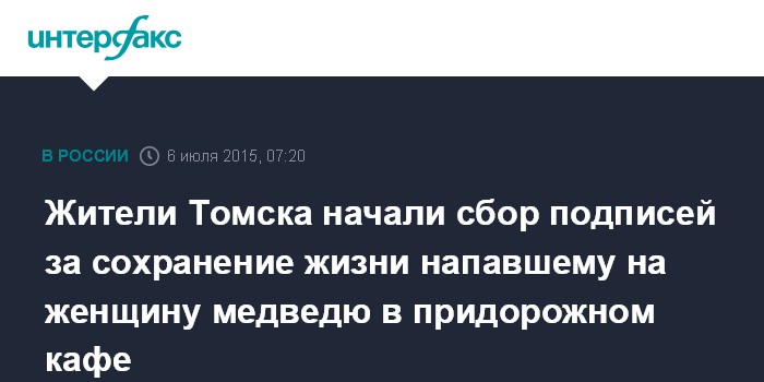 Москва. 6 июля. INTERFAX.RU - Активисты начали сбор подписей для губернатора Томской области Сергея Жвачкина с просьбой защитить медведя из придорожного кафе, который травмировал женщину.